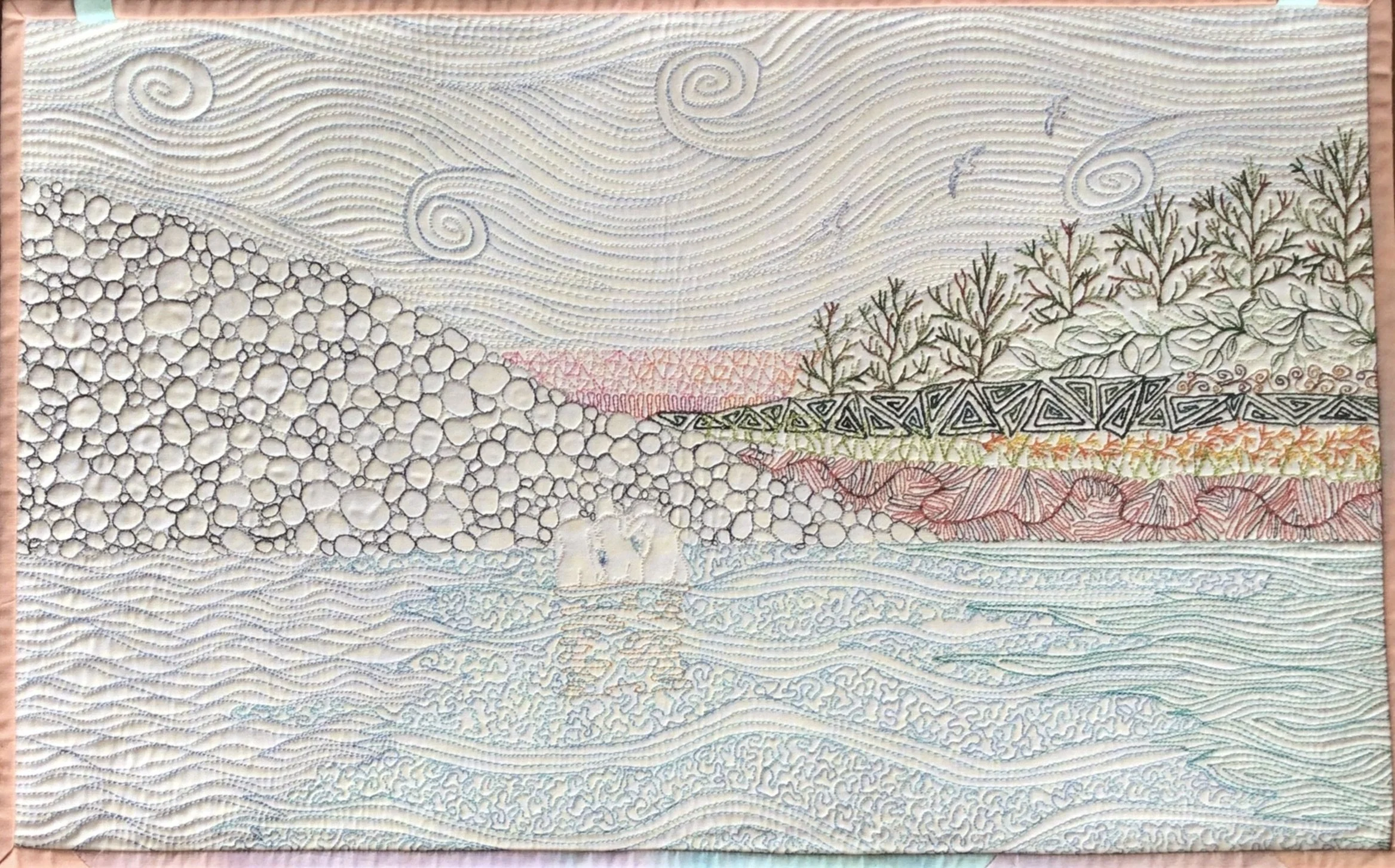 For my daughters whose matrilineal lineage is connected to the cultures of France, Ireland, Scotland and England, and in Canada to the French, English and Acadian cultures of Quebec and Prince Edward Island. The eleven generations of women are named on the DNA bars, the beads beside each name denote the generation to which the women belong. The duality of my daughter’s identities is reflected in the double DNA strand. The strand is set against the definition of feminism and matrilineality in both of Canada’s official languages.